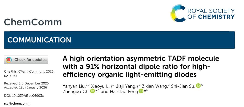 刘艳艳博士另一研究成果“High Orientation Asymmetric TADF Molecule with 91% Horizontal Dipole Ratio for High-Efficiency Organic Light-Emitting Diodes” 发表在国际著名期刊《Chemical Communications》上(影响因子4.2,SCI二区)。该工作中设计合成的新型不对称TADF分子TDCN,兼具刚性结构和优异的光物理性能。该分子在掺杂薄膜中表现出80%的光致发光量子产率和高达91%的水平偶极取向,显著提升了器件的光输出效率。基于该材料的黄光OLED器件实现了26.4%的最大外量子效率、86.1 cd/A的电流效率和76.7 lm/W的功率效率,展现出优异的综合性能。该研究为高效TADF-OLED的材料设计提供了新思路,特别是在分子取向调控和激子利用效率方面具有重要意义。刘艳艳博士为论文第一作者,冯海涛教授和五邑大学池振国教授为论文通讯作者,公司为第一完成单位和通讯单位。
