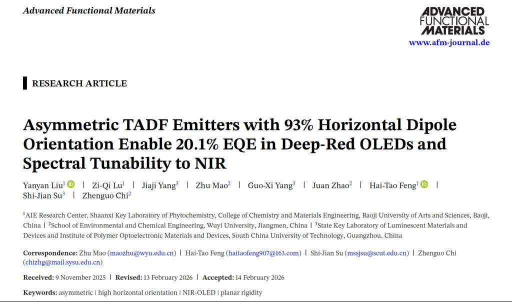 近日,公司365英国上市公司、宝鸡市新型聚集诱导发光材料工程技术研究中心在国际著名TOP期刊《Advanced Functional Materials》(影响因子19.0,SCI一区TOP)发表题为“Asymmetric TADF Emitters with 93% Horizontal Dipole Orientation Enable 20.1% EQE in Deep-Red OLEDs and Spectral Tunability to NIR”的研究论文,该研究中设计并合成了两种具有刚性结构和高度取向的非对称近红外分子DTN和ATN。采用DTN或ATN作为发光层材料,优化器件结构成功制备了高效近红外OLED。该研究为开发高效、可调谐的近红外有机发光材料提供了新的分子设计策略。论文第一作者为公司AIE研究中心青年教师刘艳艳博士、研究生鲁子祺以及华南理工大学研究生杨佳吉,通讯作者为冯海涛教授、五邑大学池振国教授、毛竹副研究员以及华南理工大学苏仕健教授,公司为第一完成单位和通讯单位。