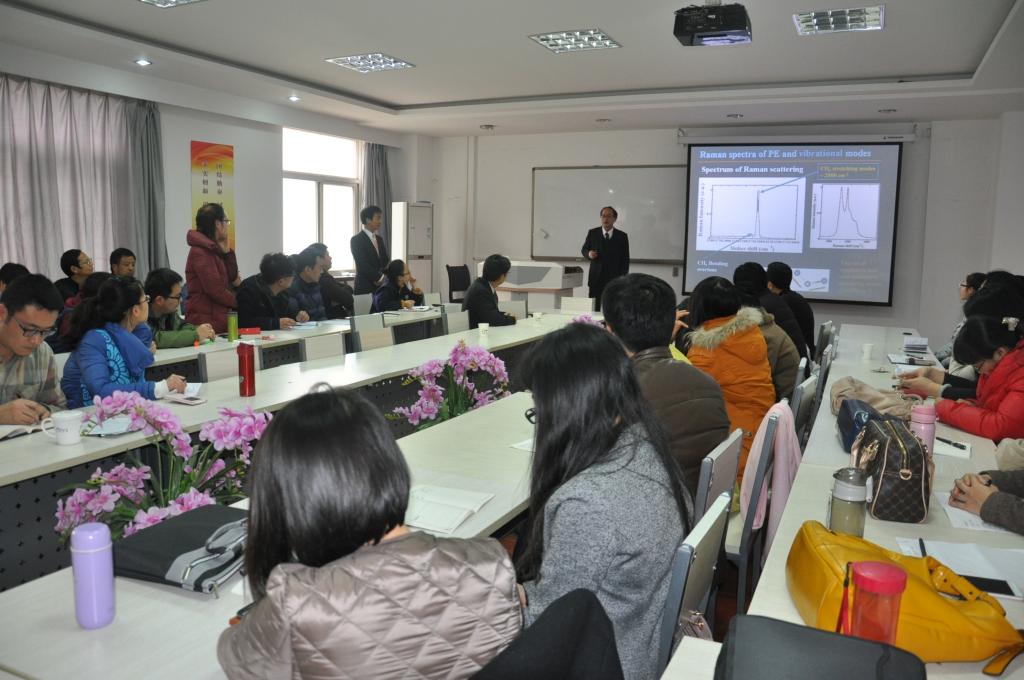 在先进材料国际学术交流会(International Academic Exchange for Advanced Materials)上,中西俊介教授、冯旗教授、凡明锦研究员、胡登卫博士分别作了题为《Introduction of Faculty of Engineering and research activities》、《Developmentof Functional Nanomaterials by Soft Chemical Process》、《GreenLubricant for Furture Life》、《Enhanced Piezoelectric & Energy Storage of TitanateNanocomposites》的学术报告。就各自的教学与科研成果进行了深入的交流与讨论,现场气氛活跃,在读硕士研究生也积极参与讨论,取得很好的效果。报告会全程使用英语作为工作语言。化学化工公司副经理陈强教授、副经理陈虎魁教授、教师代表、硕士研究生、本科生代表60余人参加了报告会。