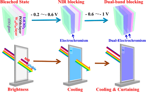 然而,因电致变色灵巧窗技术内在缺陷限制了其规模化使用,如着色效率低、响应速度慢、稳定性差和功能性不足等。顾洪溪博士等人将冠状多金属氧簇K28Li5H7P8W48O184·92H2O (P8W48)与W18O49纳米线连续组装构筑了双频调控电致变色器件。与传统的电致变色器件相比,该器件可通过施加不同电位实现主动选择性调控近红外光区与可见光区,实现亮度与温度双智能调控。并且基于P8W48与W18O49优异稳定性以及器件的精确结构控制,该电致变色器件显示出效率高、响应速度快、稳定性好等特性。这一器件的构筑与使用,为电致变色灵巧窗技术的使用和发展提供了新的思路,将极大地加速电致变色灵巧窗技术的规模化使用进程。(化学化工公司 文、图/田梅娟)