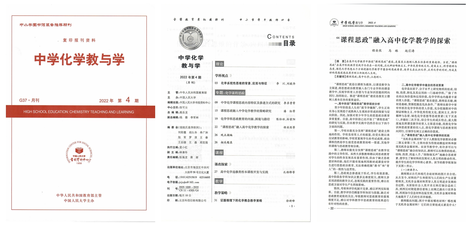 近日,公司马琳副教授教学研究团队完成的研究论文《“课程思政”融入高中化学教学的探索》被人大复印资料全文转载,转载时间为2022年4月,原文出处为《中小学教材教学》2021年第10期第54-57页。公司为该研究论文独立完成单位、通讯单位,公司2020级学科教学(化学)硕士研究生程安然为第一作者。