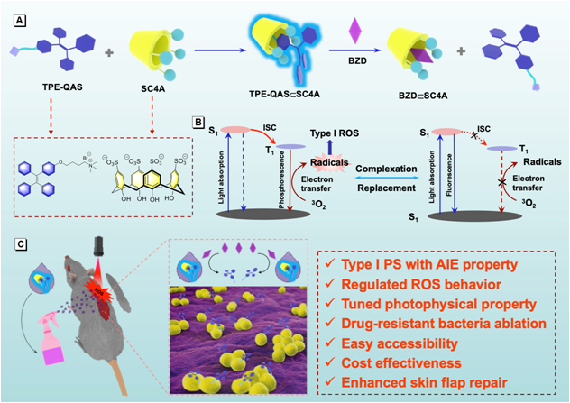 该工作基于四苯基乙烯骨架设计合成了一类能高效产生活性氧的AIE光敏剂。通过主客体组装实现了对AIE光敏剂光物理性质和暗毒性的有效调控。此外,抗菌实验结果表明,设计合成的AIE超分子光敏剂体系能够有效抑制耐药菌MRSA生长,并且将其应用于MRSA感染的皮瓣修复表现出良好的抗菌治疗效果,可以促进皮瓣的快速修复。