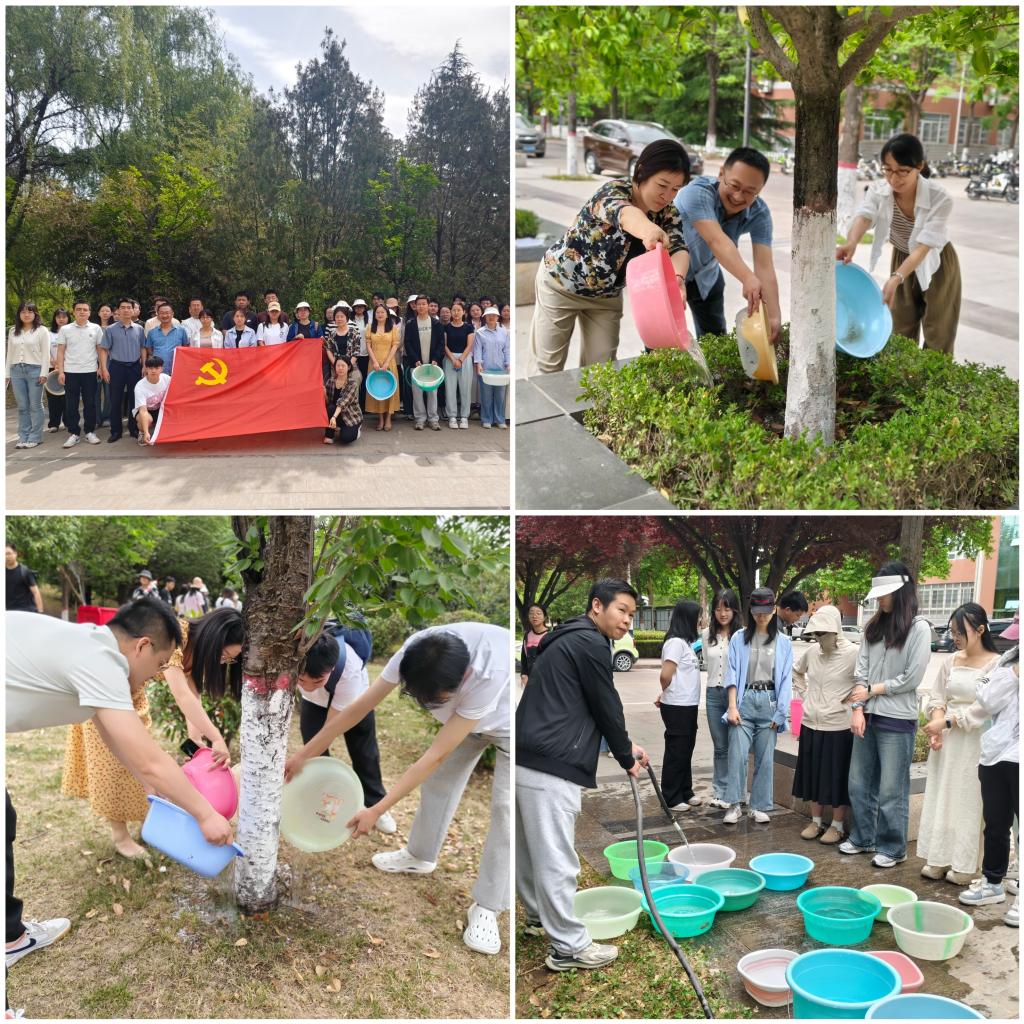 活动中,师生党员热情高涨,纷纷自带水盆、水桶等工具,迅速投入到紧张而有序的抗旱浇树工作中。大家合理分组分工,手提装满水的水盆或水桶往返于水源和绿植区域。每一位党员都全神贯注,仔细浇水灌溉每一株绿植,在大家的默契配合下,形成了取水、运水、浇灌的高效协作链条,确保每一滴水都能精准地滋润到植物的根部,为绿植送去生命之水。