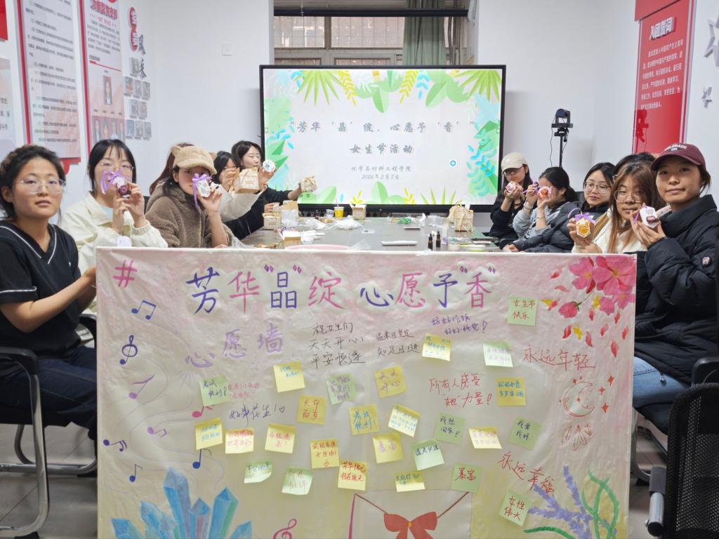 同步开展的“书写心愿寄语”则为同学们提供了情感抒发的窗口。琳琅满目的心愿卡片上,写满了女生们的真挚心声:既有对学业进步、实验顺利的期盼,也有对美好未来、多彩青春的憧憬,还有对身边师长、同窗的深深祝福。字里行间,流淌着化材公司女生们的温柔、坚韧、自信与梦想。这些心愿卡片与一旁的创意扩香石相映成趣,共同构成了一幅生动而温暖的青春画卷。